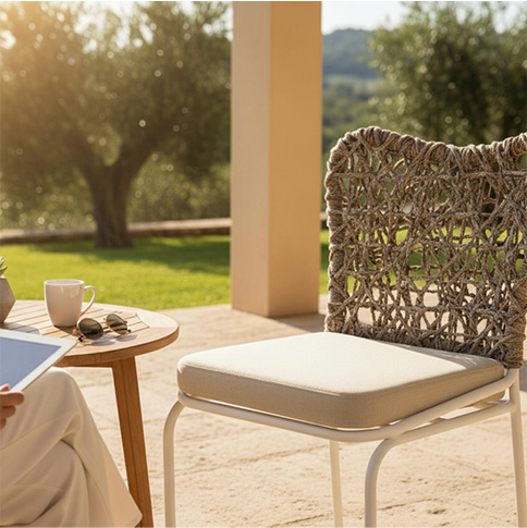 A estrutura em alumínio, a pintura eletrostática e os acabamentos como corda náutica, tela sling, fibra sintética e tecidos Solaris ou Aquablock garantem resistência ao sol, chuva e variações climáticas — mantendo durabilidade e estética por muitos anos.
