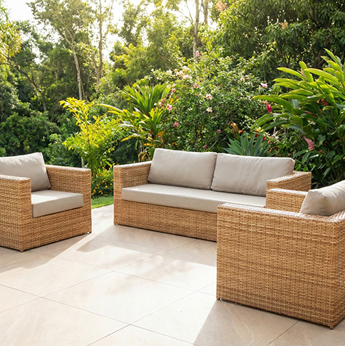 A estrutura em alumínio, a pintura eletrostática e os acabamentos como corda náutica, tela sling, fibra sintética e tecidos Solaris ou Aquablock garantem resistência ao sol, chuva e variações climáticas — mantendo durabilidade e estética por muitos anos.