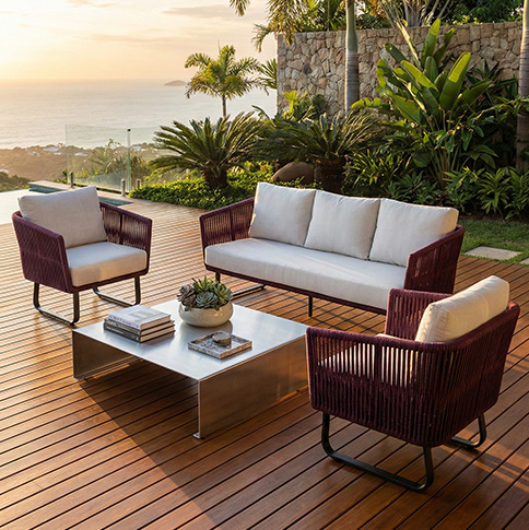 A estrutura em alumínio, a pintura eletrostática e os acabamentos como corda náutica, tela sling, fibra sintética e tecidos Solaris ou Aquablock garantem resistência ao sol, chuva e variações climáticas — mantendo durabilidade e estética por muitos anos.