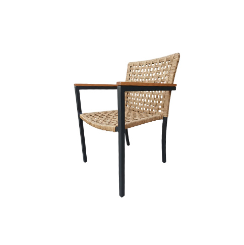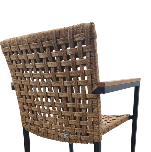 Acabamentos, como corda náutica, tela sling, fibra sintética e detalhes em madeira.