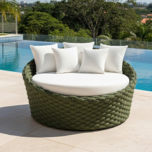 A estrutura em alumínio, a pintura eletrostática e os acabamentos como corda náutica, tela sling, fibra sintética e tecidos Solaris ou Aquablock garantem resistência ao sol, chuva e variações climáticas — mantendo durabilidade e estética por muitos anos.